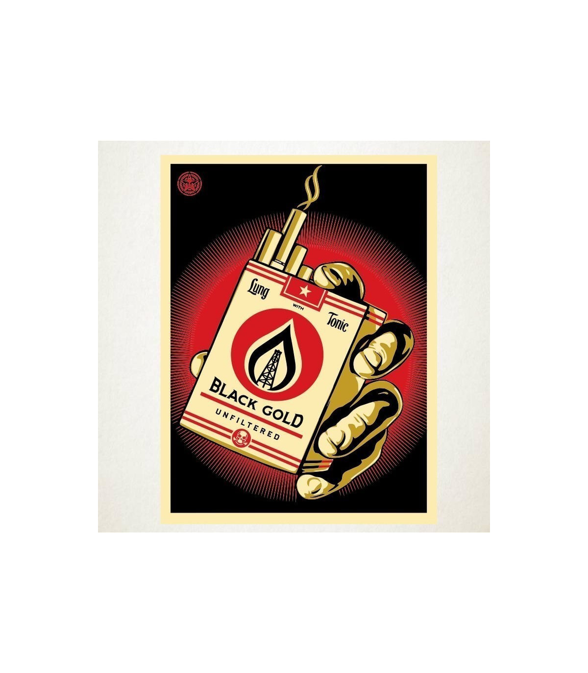 El adhesivo de vinilo es una replica de un cartel donde se ironiza sobre el mismo oro negro que también esta presente en el tabaco.