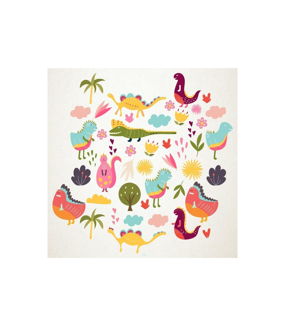 Dinosaurios de diseño naif muy elegantes para decorar espacios infantiles con colores calidos.