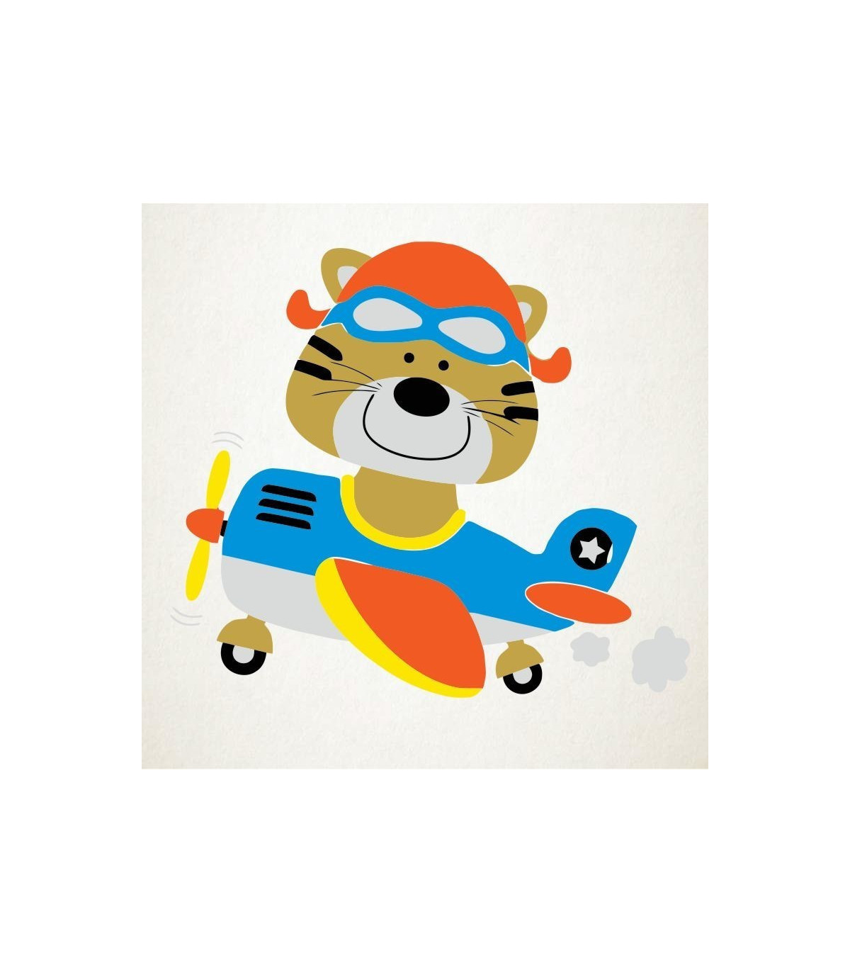 Gato pilotando un avion, en un diseño que transmite una alegre serenidad en una composición calida y tierna para decorar espacios infantiles.