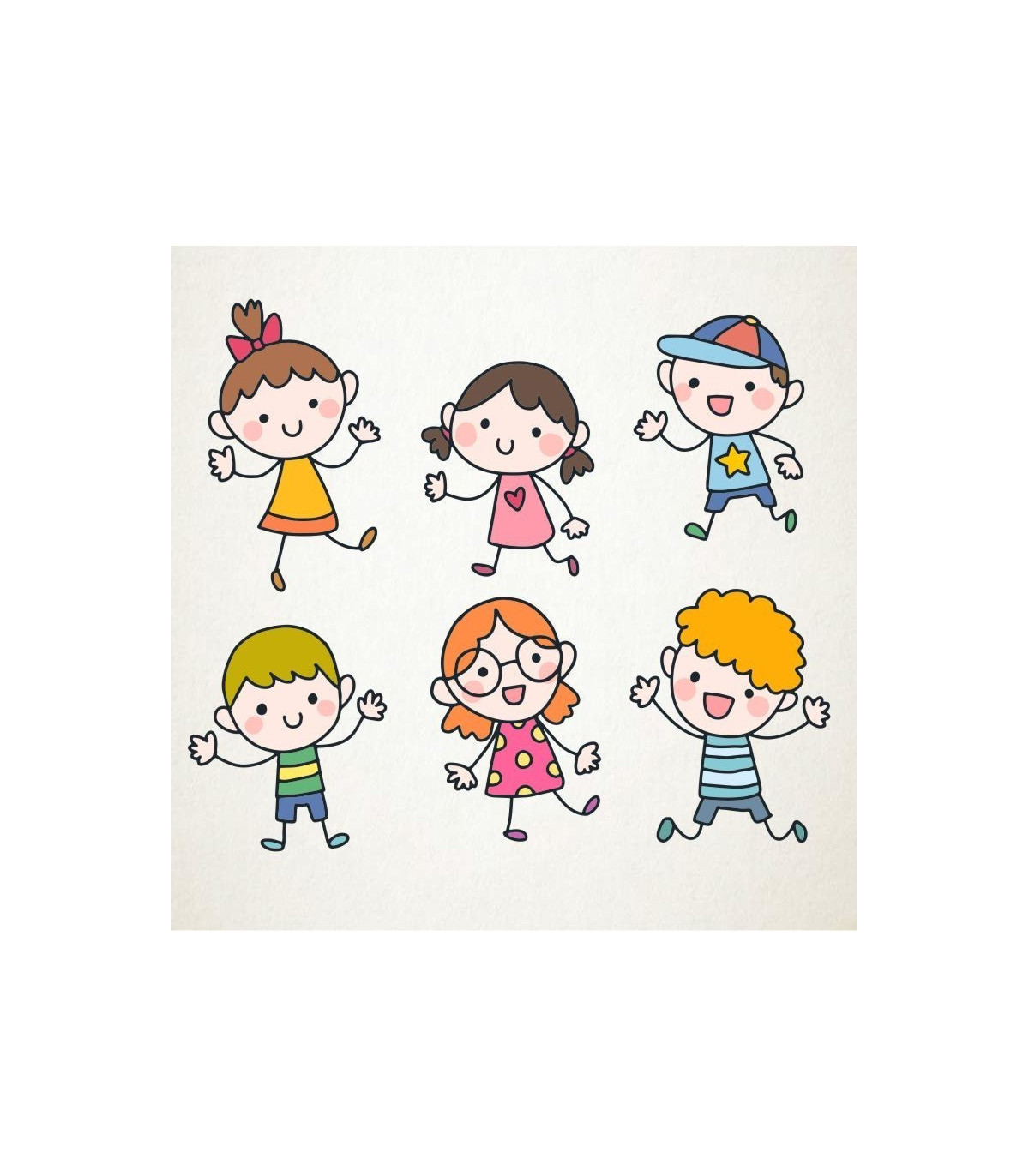 Composición de seis figuras de niños alegres, con un diseño elegante que rememora los dibujos a lapiz.