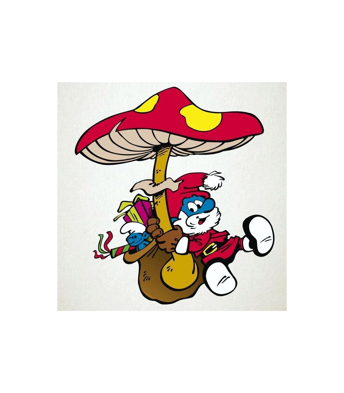 se representa como papa noel con el saco de regalos y llevando como paraguas una seta.