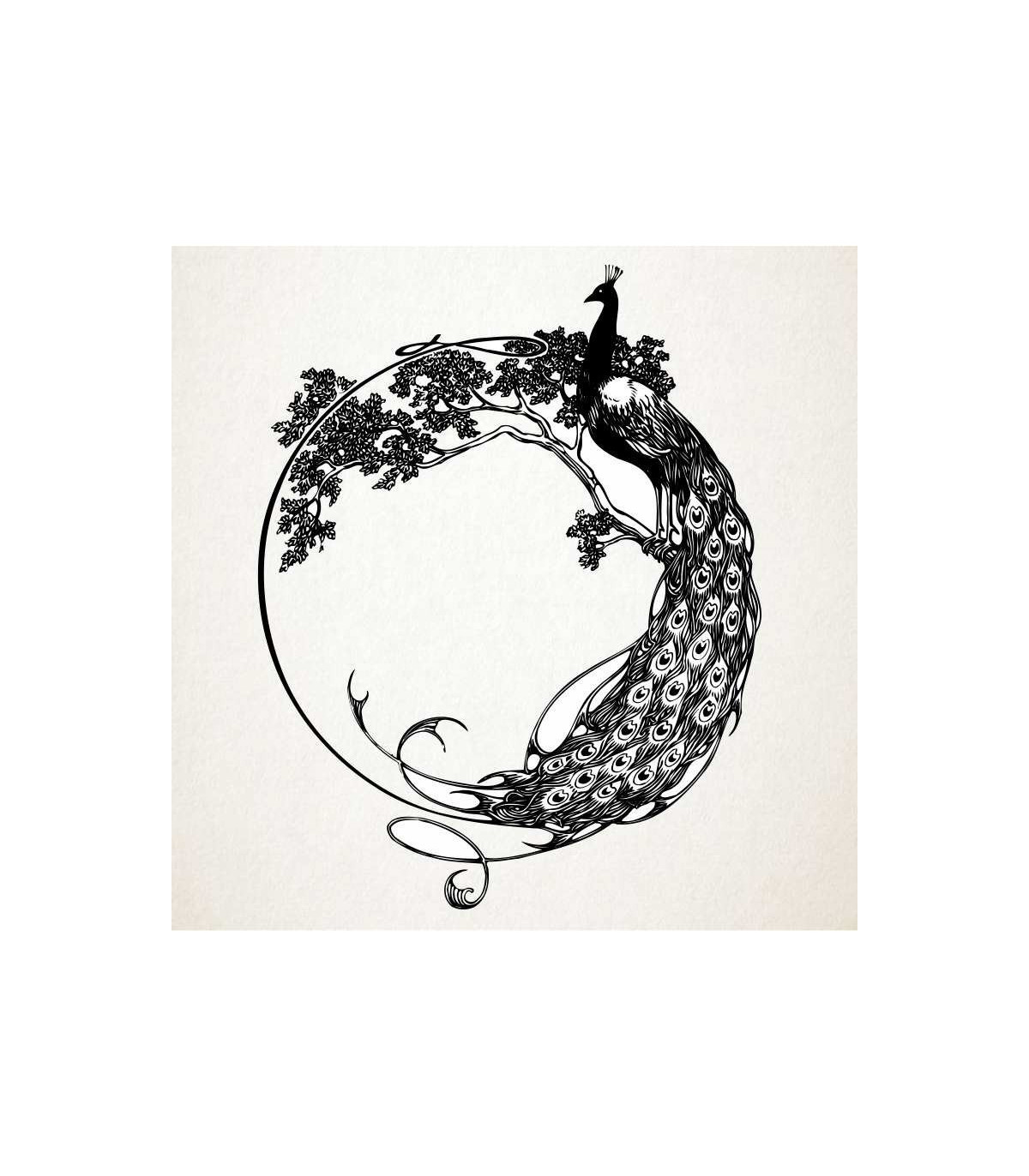 Sticker con un motivo decorativo de un pavo real que en su cola se pueden enmarcar otros elementos decorativos como pequeños estantes relojes...