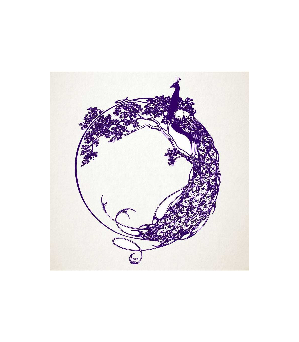 Vinilo con un motivo decorativo de un pavo real que en su cola se pueden enmarcar otros elementos decorativos como pequeños estantes relojes...